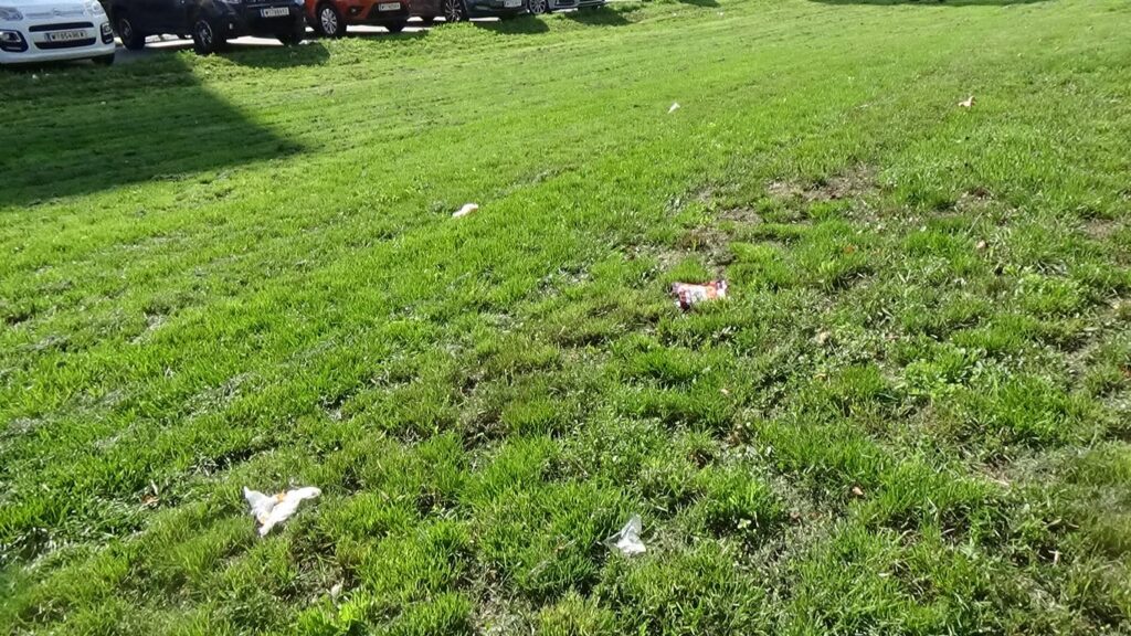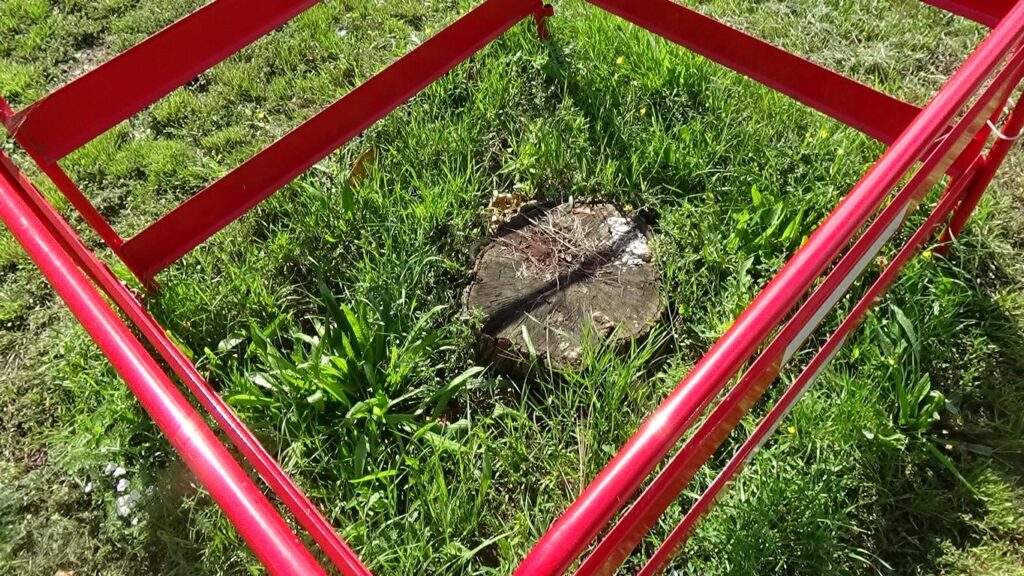Ein Lokalaugenschein Ende September 2025 ergab nämlich ein ernüchterndes Bild: Rot-weiße Metallabsperrungen und alte Baumstümpfe verweisen noch immer auf Baumleerstände. Am fehlenden Platz für verpflichtete Nachpflanzungen kann es nicht gelegen sein, denn ohne Bäume ist diese Grünfläche nur eine grüne Rasenfläche – sh. Fotos!