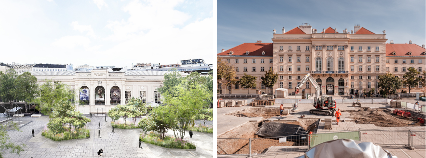 Fotoquelle: Visualisierung Staudeninseln im MQ Haupthof © DnD Landschaftsplanung ZT GmbH | Begrünung des MQ Haupthof © MuseumsQuartier Wien, Foto: Thomas Meyer